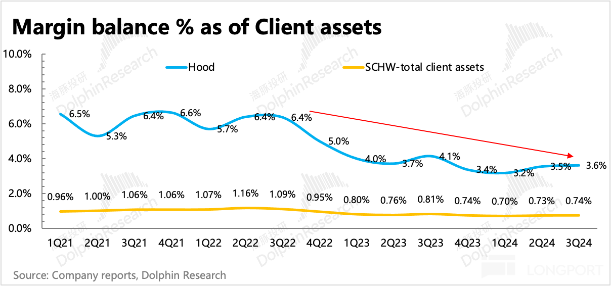 而海豚君推算下來,嘉信的融資業務收入佔比也是 15%,對應貸款餘額的收益率相比 Robinhood 還稍高一些,但爲何嘉信卻無法無限製拉高融資業務?